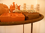 Die Teile stehen auf einer kreisrunden Eisenplatte, die wiederum auf vier Eisenstehern aufliegt.